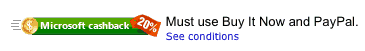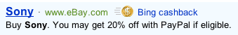 * Visit bing.com/shopping and run a search for “sony”. Look for an ad about cashback from eBay (see above). Click and you should see this image at the top to confirm your 20% cashback: