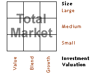 So far we’ve looked into the stock/bond ratio and the domestic/international ratio. Instead of taking these total stock markets as whole, you can further subdivide them into “styles” or additional asset classes. Although these vary in specific definition, in the general layout is shown by the Morningstar style box shown to the top right.