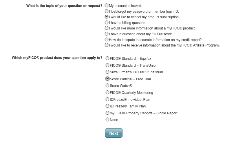 37. My boyfriend and I each just went through the process (7/30/12), got our FICO scores and history information, immediately went to the “support” and “email” and the “I would like to cancel my product subscription” option WAS there, and it was simple and fast, following the instructions above. We both received cancellation emails, and seems like it worked well and we didn’t have to pay for it at all. Thanks for the info!