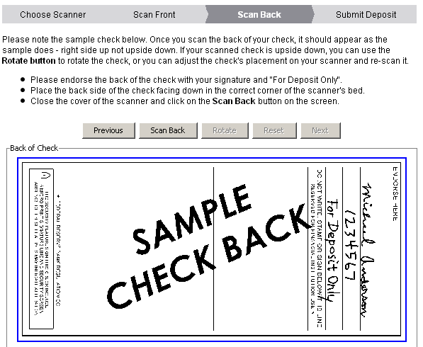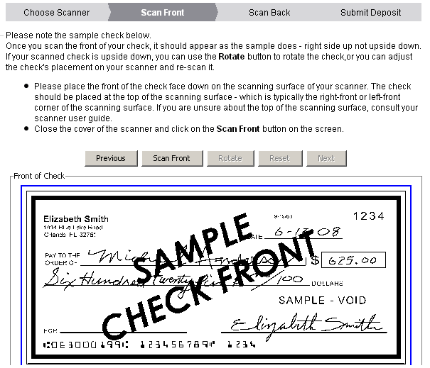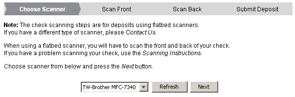 2. Click on the “Make A Deposit” link on the left. A java applet will load. The software will look for attached scanners. Choose the one you wish to use. [screenshot 1]