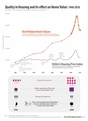 Catherine over at Visualizing Economics has another nice graphic on Housing Quality and its effect on Home Values. In the top chart, she shows how inflation-adjusted median home values have increased due to the fact that the median home has changed (bigger, better plumbing). This is in contrast with the popular Case-Shiller home price chart, which tracks the inflation-adjusted resale value of a fixed-size house in large metro areas.