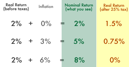 What if inflation is 3%, but you are slightly happier because you’re earning 2% above that for a total of 5%. Income tax stays the same, 25%. But now you’re paying 5% x 0.25% = 1.25% a year in taxes, and after 3% inflation you are left with 0.75% as your after-tax real return. Even worse.