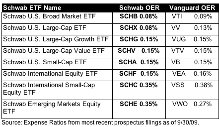 The most commonly-noted drawback of ETFs is that you must buy them like a stock and thus pay trade commissions. However, if you buy these within a Schwab brokerage account, there are no commissions charged. Here is a chart comparing the new Schwab ETFs and their corresponding competitor from Vanguard. The ETFs don’t necessarily track the exact same index, but they are pretty similar.