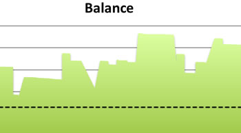 In addition, we note the high and lowest balances for the last 30 days. This helps keep a rough trend that we are headed in the right direction. Here is an graph made from the actual daily balances of our checking account from the last few months: