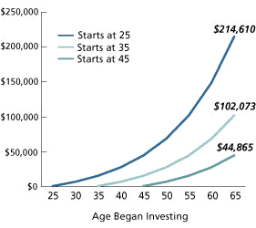 The graph on the right shows three investors, each of whom invests just $1,000 a year until age 65. However, one begins at age 25, investing a total of $40,000; one at age 35, investing a total of $30,000;