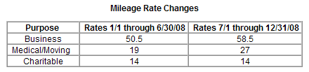 One of the more tedious tax deductions for self-employed folks is deducting transportation expenses. The simplest way to claim this deduction for those without vehicles used solely for business is to track the number of miles driven for business use. (You can also record actual automobile expenses like gas and maintenance, and pro-rate.) The IRS just announced yesterday that the standard mileage deduction will be 58.5 cents/mile for all business miles driven for the last half of 2008, up from 50.5 cents/mile.