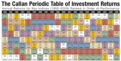 As a reminder that being this year’s best performing asset class is no guarantee of for future years, here’s the Callan Periodic Table of Investments that shows the relative performance of 8 major asset classes over the last 20 years. You can find the most recent one below (click to view PDF), which covers 1990 to 2009. (No update to include 2010 yet.) You can find previous versions here.