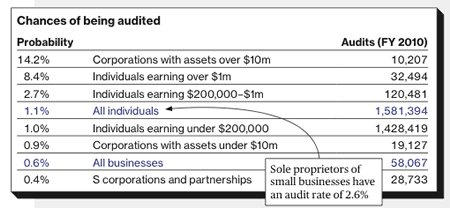 The sole proprietor audit rate interests me (bc I am one!) Do you think this has to do with the supposed likelihood that you are “flagged” by the IRS if you claim a deduction for a home-based business? I have one, and it is legit. But who wants to be on the IRS’ bad side? Any thoughts by those who have taken it?