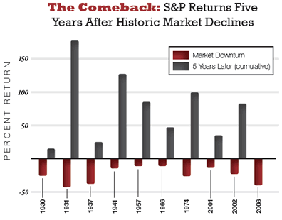 Here’s another chart to ponder, found as part of an Emergency Physicians Monthly article about investing during recessions. It shows what has happened in the past to the S&P 500 five years after a significant market decline.
