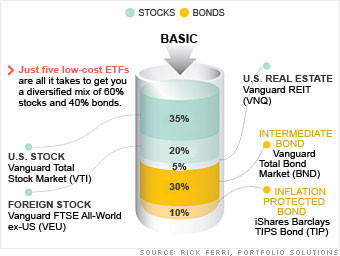 In a recent Money magazine article about ETF Investing, there is a nice illustration of a simple and diversified portfolio made entirely of ETFs by author/money manager Rick Ferri: