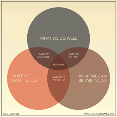 Bud Caddell shows us how to be happy in business with a clever Venn diagram. Very insightful and concise!