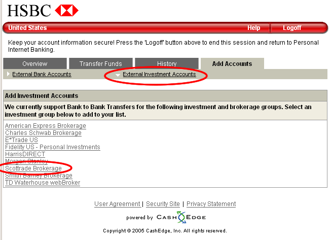No tricks here, if you satisfy (a) Scottrade will give you check writing capability upon request. You can then either use the checks themselves or the account and routing numbers on them to link with other accounts. If you use a CashEdge-based system like with HSBC Direct, it’s even built in; Here’s a screenshot. They say that if you go below $5,000 later you may lose checkwriting privileges, but I’ve been under for about a month now with no consequences.