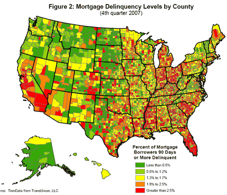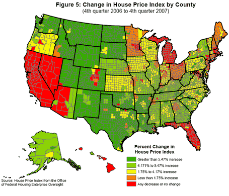 However, some areas seems to be fairing better than others, even if only being one county over. In a recent speech by Ben Bernanke, he showed some interesting geographical heat maps revealing the variation in both foreclosure rates and price trends across the country. Keep in mind the graphs only go until the end of 2007.