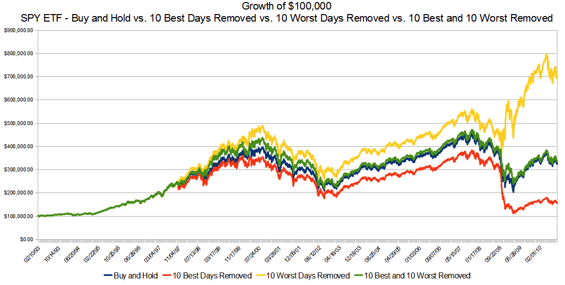 I completely disagree with your summary that this chart shows you should be focused on taking out the 10 best and 10 worst days, although I agree with your ultimate conclusion to just buy and hold.