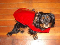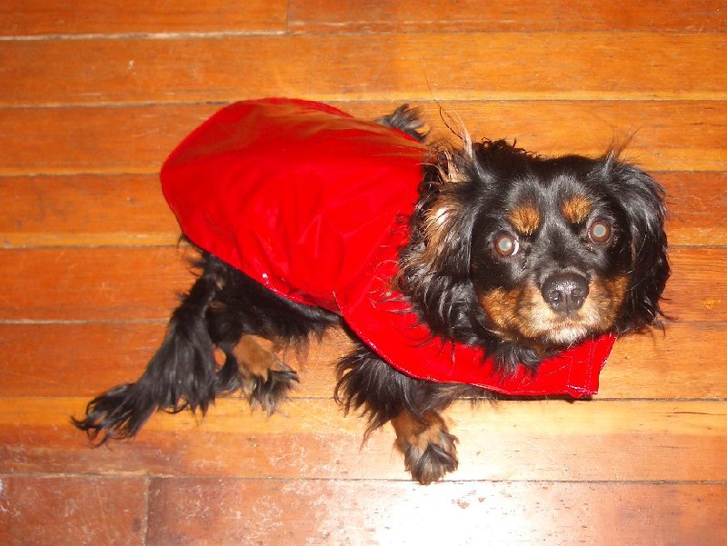 Prototype #1: A handmade reversible raincoat/jacket, as modeled by our dog James. This is all made by my wife, with fabric scraps. One side is softer fleece, the other is waterproof. It has Velcro for easy attachment/detachment.