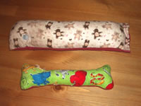 Prototype #2: Fleece dog toys with squeakers inside for hours of fun and amusement. As you can see with the holes, we are currently going through QA testing, and are making the new models with thicker material and better stitching.