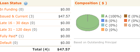 The good news is that out of my two previous late loans, one of them is now current again and the other one is on a “payment plan”. I am not sure if that means they lowered the amount due, or that they are just allowing a slower payback temporarily, but it is again showing regular payments (and contact) from the borrower. Much better than reading “left voicemail. left voicemail. we haven’t heard from them in 4 months…”. I have no defaults to date.