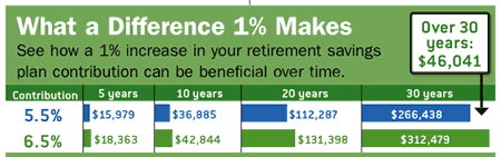 Assuming yearly salary raises of 3% and a 6.3% annual rate of return, bumping up that contribution rate by just one percentage point, to 6.5%, could potentially improve savings by close to $6,000 in 10 years and more than $46,000 in 30 years. [source]