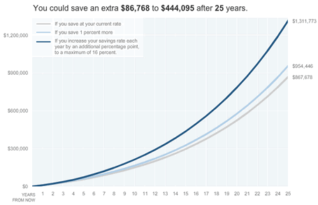 If you’re like me, your 401k plan comes with a little newsletter each month. A common theme in the world of personal finance advice is to nudge up your savings by one more percentage point a year.