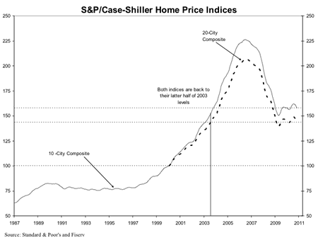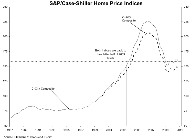 Data through November 2010, released today by Standard & Poor’s for its S&P/Case-Shiller1 Home Price Indices, the leading measure of U.S. home prices, show a deceleration in the annual growth rates in 17 of the 20 MSAs and the 10- and 20-City Composites compared to what was reported for October 2010. The 10-City Composite was down 0.4% and the 20-City Composite fell 1.6% from their November 2009 levels. Home prices fell in 19 of 20 MSAs and both Composites in November from their October levels.