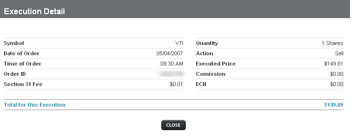 #2: After the market closed on Day 1, I went ahead and placed a sell order on my single share of VTI at my buy price of $149.16. My goal was simply to get my money back. My order was filled right at market open (9:30am) for $149.81. Here is a screenshot from my order history.